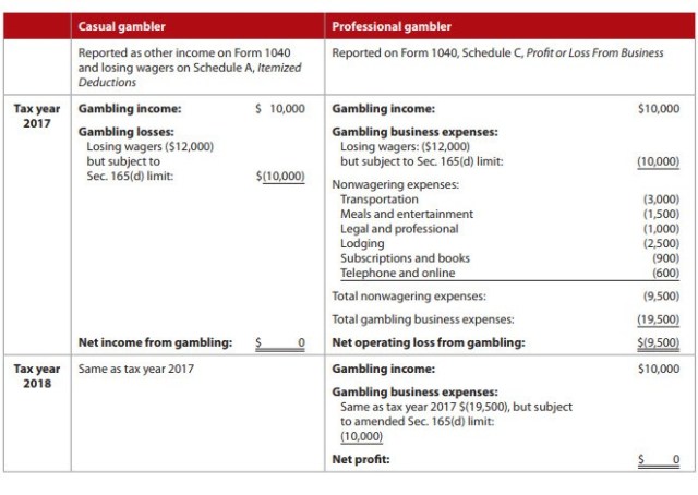 Depending on whether G is a professional or casual gambler, either of two tax treatments could result for each year. If G is a casual gambler, the amendment of Sec. 165(d) has no effect on him. He should report his gambling income of $10,000 on Form 1040, U.S. Individual Income Tax Return, and $10,000 of his wagering losses on Schedule A in both 2017 and 2018. If G is a professional gambler, he could claim an NOL of $9,500 from gambling activities in 2017, as shown in the chart. However, under the amended Sec. 165(d), G may deduct his wagering losses and nonwagering gambling-related business expenses only to the extent of his gambling winnings, for a net zero income from gambling activities in 2018.