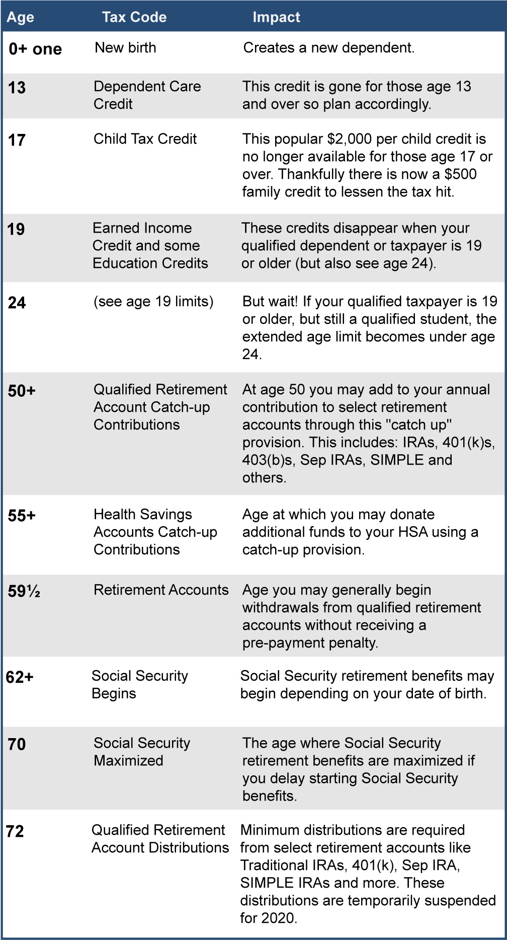 One of the elements that make our Federal Tax Code so hard to follow is that different laws apply to you based on you or your dependents’ age. To help you navigate through some of this maze here is a chart that outlines key ages and how it applies to your tax obligation.
