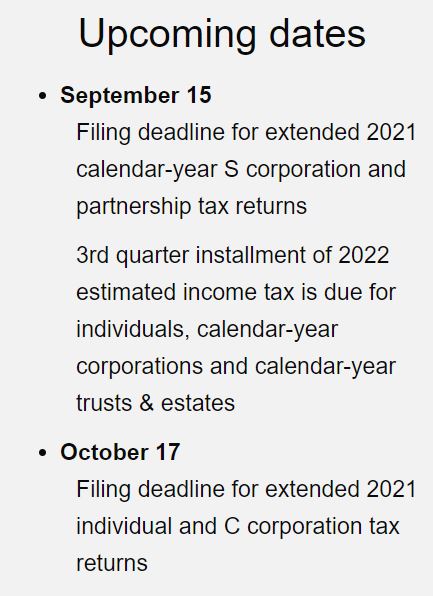 - 3rd quarter installment of 2022 estimated income tax is due for individuals, calendar-year corporations and calendar-year trusts & estates